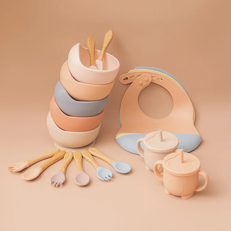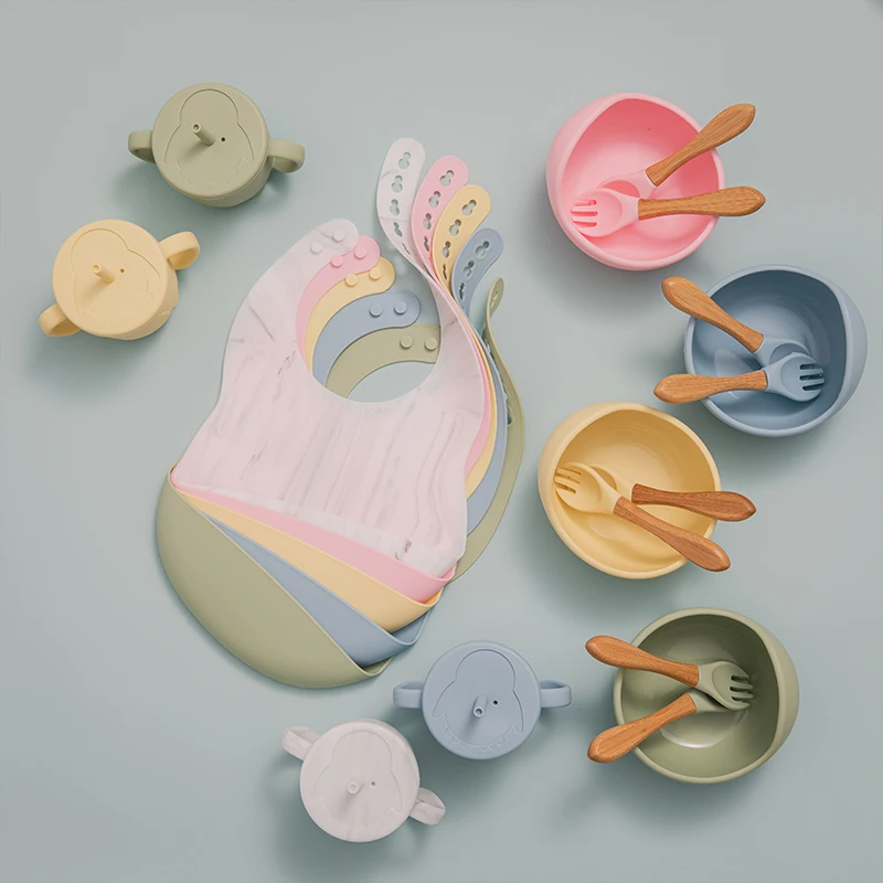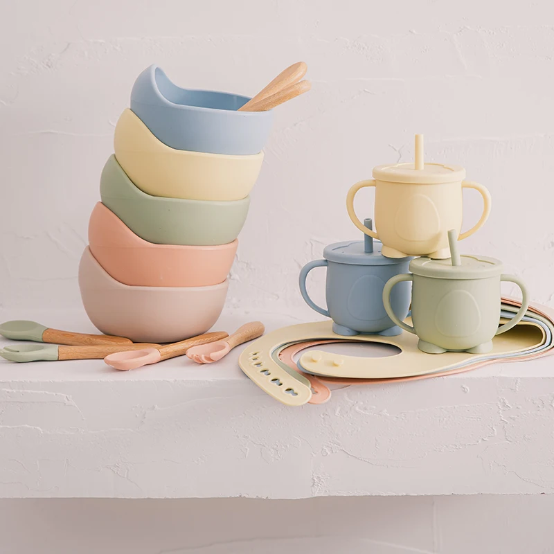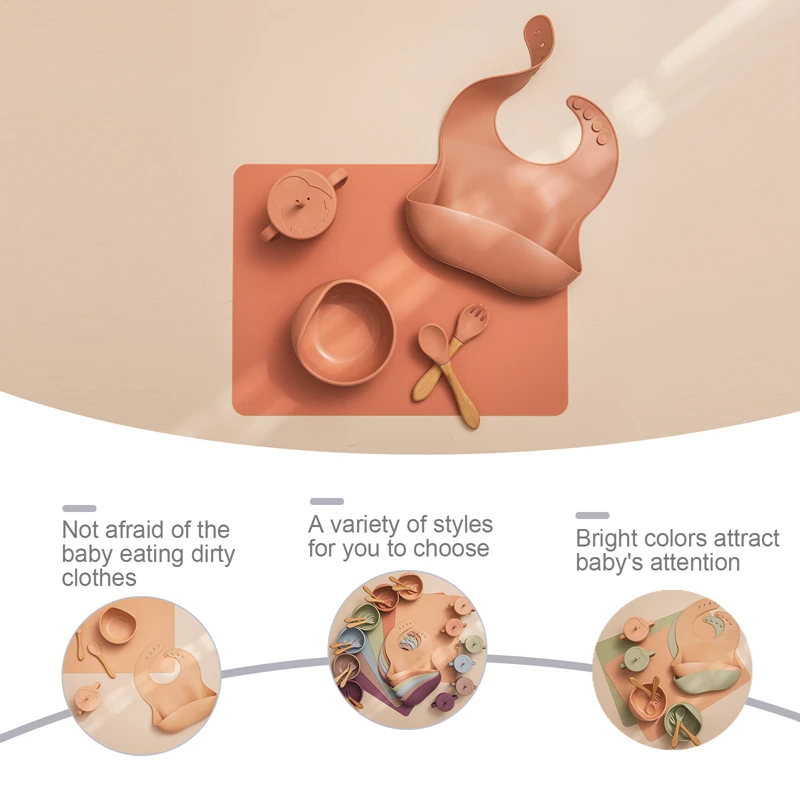 5Pcs Baby Feeding Bowl Sets Kids Silicone Non-Slip Tableware Dinner Plate with Bibs Cup Spoon Fork Dinnerware for Children