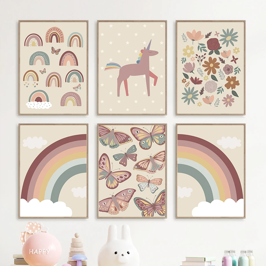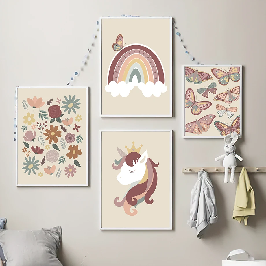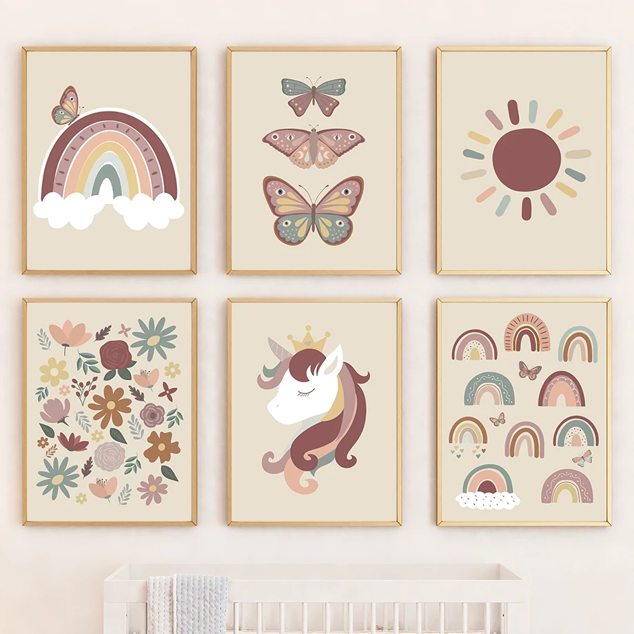 Sun Rainbow Butterfly Unicorn Flower Wall Art Canvas Painting Nordic Posters and Prints College Apartment Kids Girl'S Room Decor