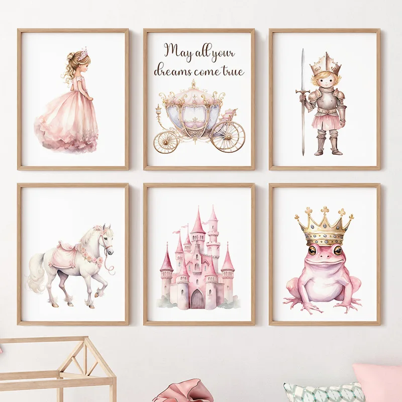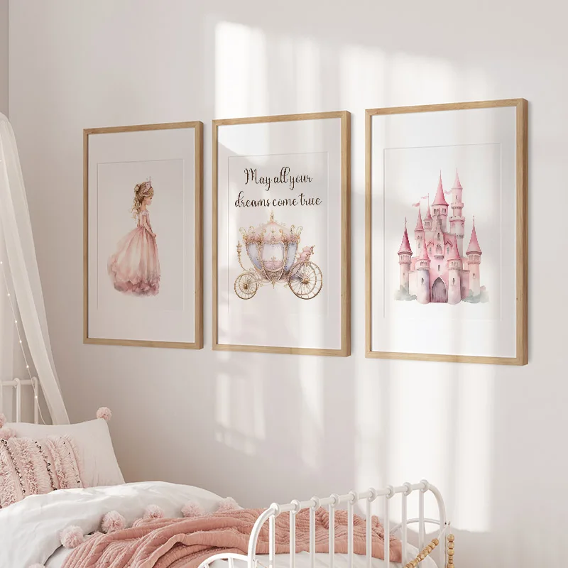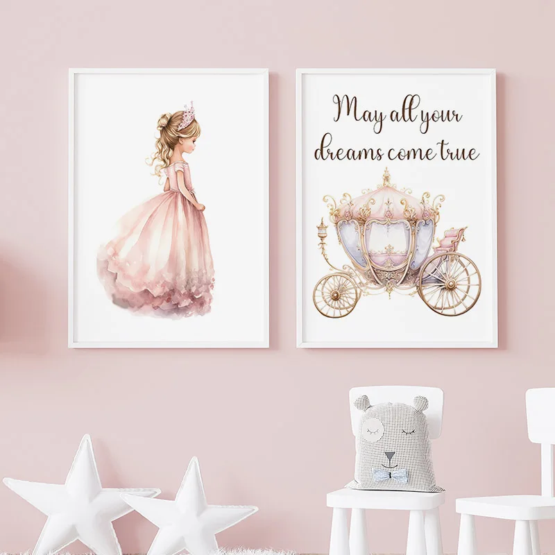 Wall Art Canvas Painting Princess Pumpkin Cart White Horse Prince Girl Nordic Posters Prints Pink Pictures Baby Kids Room Decor